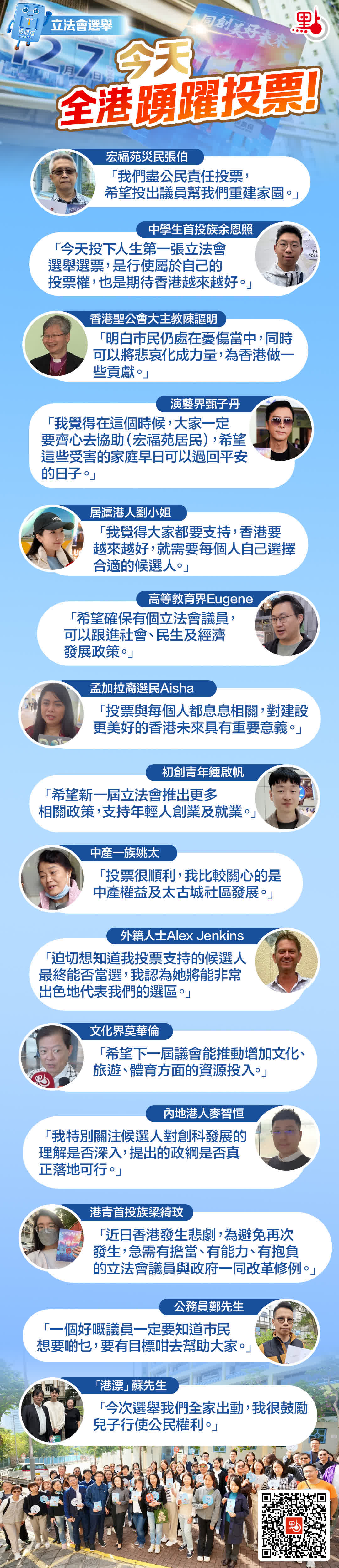 (大公文匯全媒體記者綜合報(bào)道)立法會(huì)換屆選舉今日(12月7日)舉行,一般投票站的投票時(shí)間為上午7時(shí)30分至晚上11時(shí)30分。社會(huì)各界積極響應(yīng)投票,履行作為公民的責(zé)任。大公文匯全媒體記者在多個(gè)票站現(xiàn)場(chǎng)觀察到,投票人群中既有百歲老人和輪椅選民,又有中學(xué)生首投族、少數(shù)族裔、港漂首投族等;大公文匯全媒體記者還在大埔受影響票站採(cǎi)訪到多位宏福苑災(zāi)民,他們表示,希望通過(guò)投票選出有能力的議員,讓新一屆立法會(huì)盡快履職,協(xié)助政府進(jìn)行救災(zāi)善後工作。大公文匯全媒體製作了社會(huì)各界踴躍投票的一圖,快來(lái)睇下!