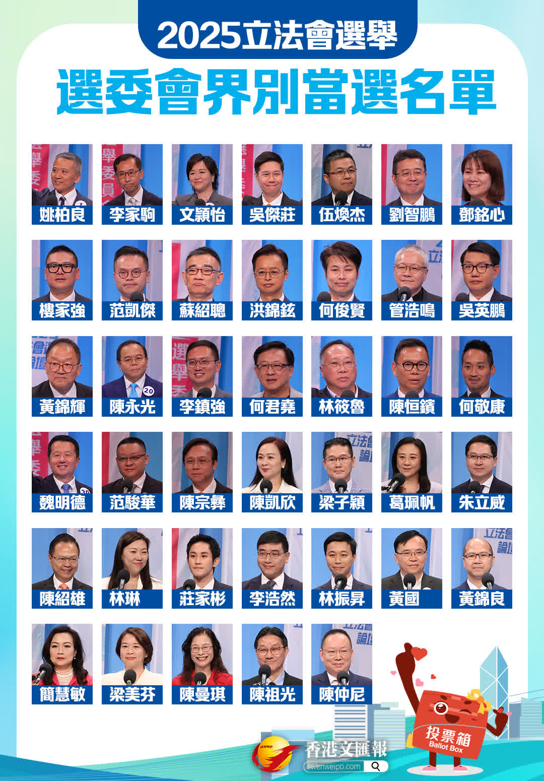 姚柏良、李家駒、文頴怡、吳傑莊、伍煥杰、劉智鵬、鄧銘心、樓家強(qiáng)、范凱傑、蘇紹聰、洪錦鉉、何俊賢、管浩鳴、吳英鵬、黃錦輝、陳永光、李鎮(zhèn)強(qiáng)、何君堯、林筱魯、陳恒鑌、何敬康、魏明德、范駿華、陳宗彝、陳凱欣、梁子穎、葛珮帆、朱立威、陳紹雄、林琳、莊家彬、李浩然、林振昇、黃國、黃錦良、簡慧敏、梁美芬、陳曼琪、陳祖光、陳仲尼
